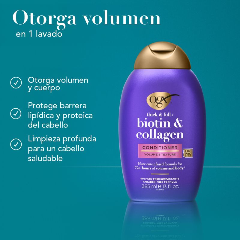 El Shampoo OGX Biotin & Collagen contiene Biotina y cola´geno que ayudan a dar volumen y textura y un look más voluminoso y brillante a tu pelo. Esta súper fórmula ayuda a dar volumen y textura a cualquier tipo de pelo. Ayuda a infundir nutrientes en todos los cabellos y genera una apariencia de cabellos más gruesos y saludables. Indicado para los siguientes tipos de pelo: Normal a Dañado, Fino, Sin volumen, Teñido. Ideal para uso diario.