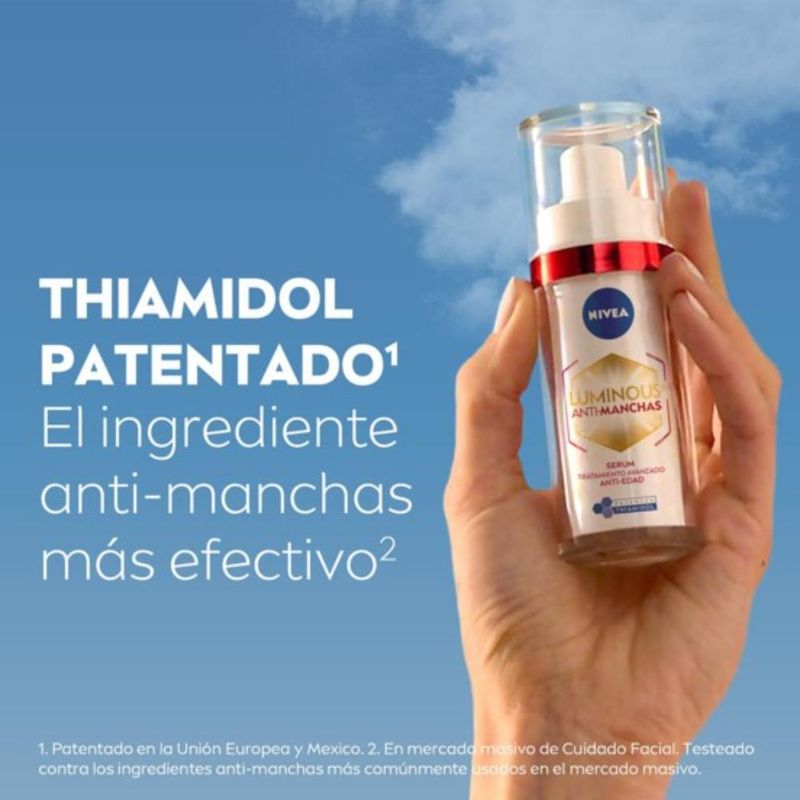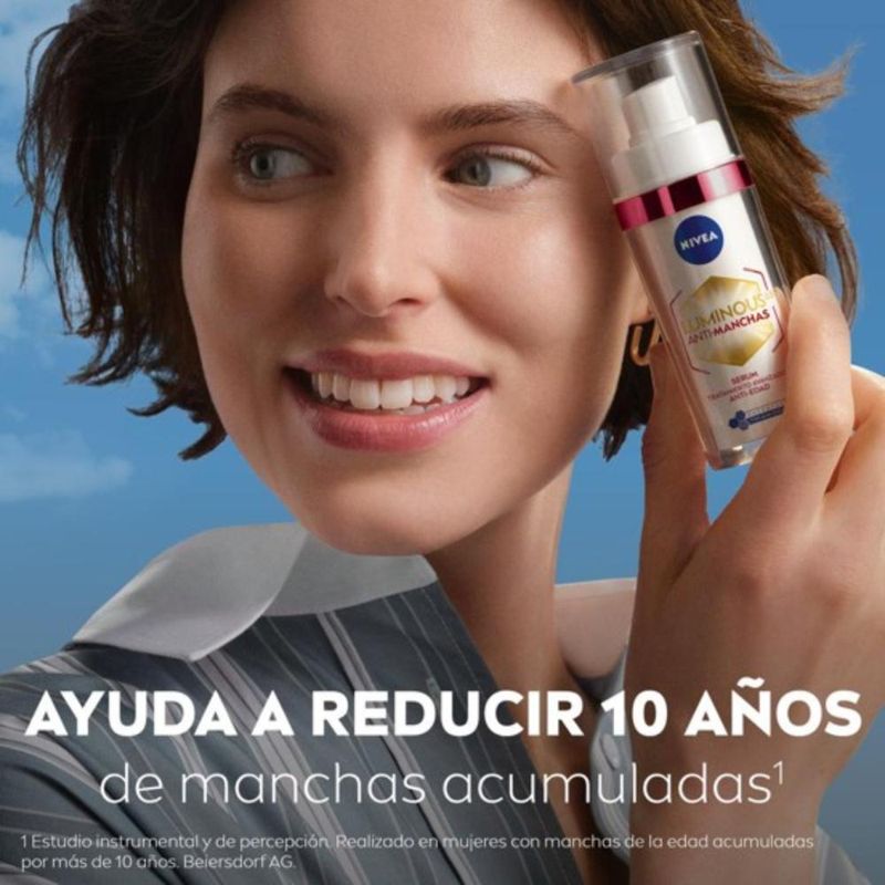 El Serum Anti-Manchas y Anti-Edad NIVEA Luminous630 contiene ingredientes potentes que ayudan a reducir hasta 10 años de signos de envejecimiento acumulados. Su fórmula está enriquecida por Ácido Hialurónico y Thiamidol, que nutre profundamente la piel, elimina la pigmentación, reduce las líneas finas, mejora la elasticidad de la piel y rellena incluso las arrugas profundas en 7 días. Agrega este sérum a tu rutina diaria de cuidado de la piel para devolver rejuvenecimiento y vitalidad a tu piel. Adecuado para pieles sensibles.