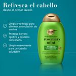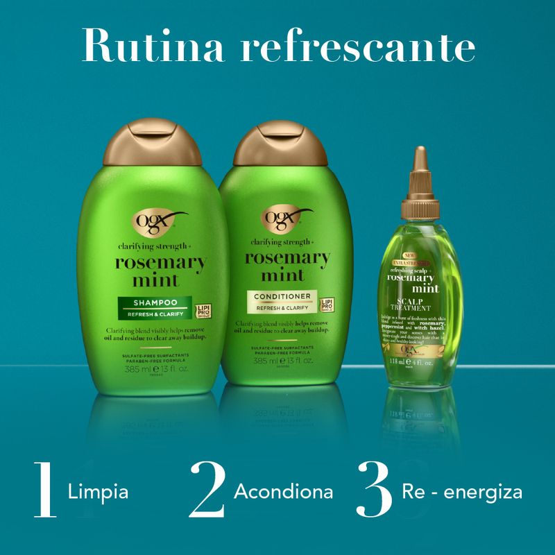 Elimina visiblemente la grasa y los residuos de tu cabello con el champú OGX Clarifying Strength + Romero y Menta. Este champú de la marca n.° 1 en reparación capilar* ayuda a eliminar la acumulación de grasa en tu cabello. Nuestra fórmula mejorada protege el cabello de la pérdida excesiva de lípidos y proteínas que causa frizz y quiebre. Ahora con la tecnología Lipi Pro Shield™, este champú clarificante proporciona el doble de protección de proteínas y lípidos para un cabello saludable.** El champú, enriquecido con aceite de romero y extracto de menta, refresca y aclara visiblemente tu cabello. Aplícalo sobre el cabello mojado, masajea hasta formar espuma, enjuaga y aplica un acondicionador OGX. El champú de romero ha sido cuidadosamente formulado sin tensioactivos sulfatados, parabenos, ftalatos, microplásticos ni colorantes.